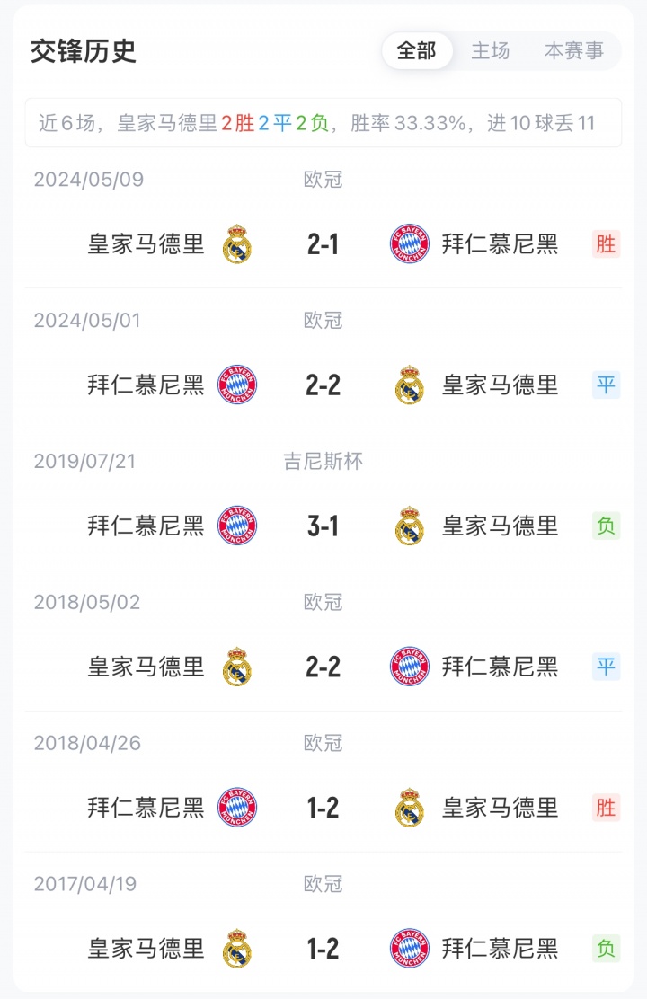 两队此前28次相遇中,皇马与拜仁战成12胜4平12负的绝对均势;欧冠22次交锋中,皇马10胜3平9负稍占上风。